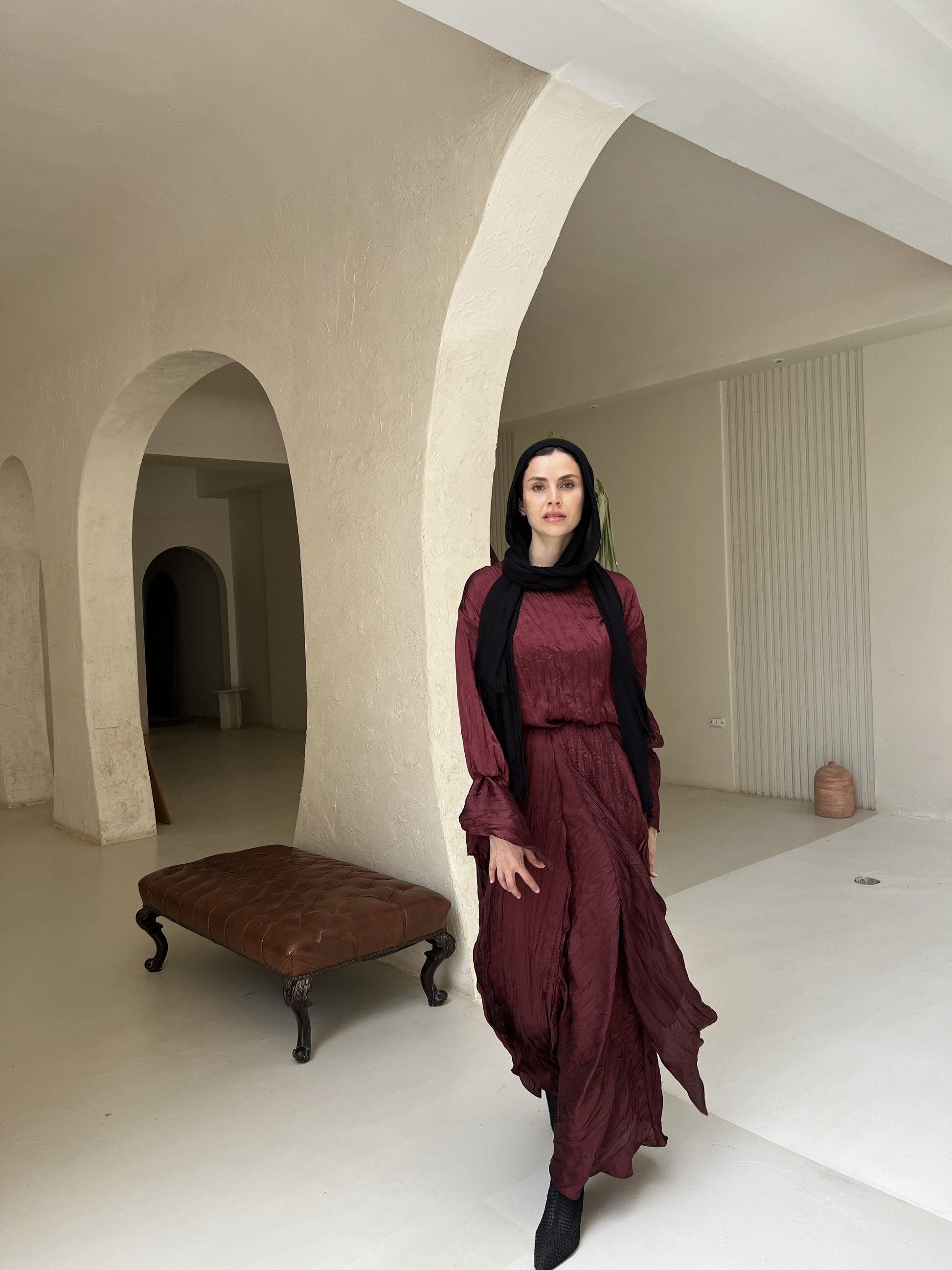 Satin plisse set in Maroon